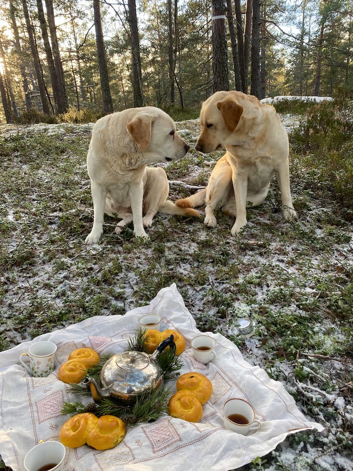 Tembea na mbwa wa labradori wapendwa, simama ili uchunguze ulimwengu wa kuvumwani kwa kutumia darubini na uangalie ndege kutoka kwenye mnara tulivu.