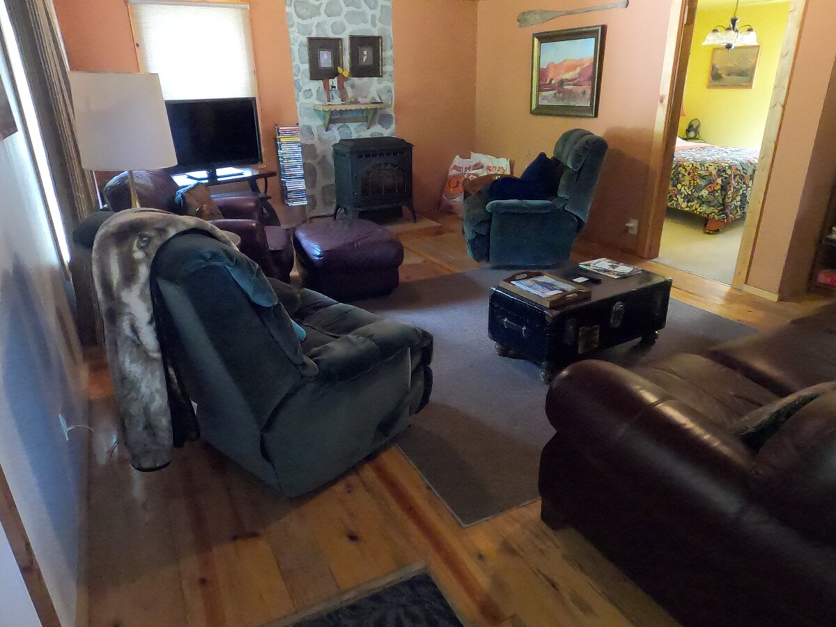 Pata mchanganyiko kamili wa mapumziko, jasura na tija kwenye nyumba yetu ya kupendeza ya ufukweni. Imewekwa kwenye ekari 2 za ardhi safi, nyumba hii ya familia ya ghorofa mbili iliyokarabatiwa hivi karibuni (nyumba ya mbao) inatoa kila kitu unachohitaji kwa ajili ya ukaaji usioweza kusahaulika. Furahia wikendi ya uvuvi, furaha ya familia au likizo tulivu mbali na kazi au ofisi nzuri ya likizo. Njia zinazoweza kutembezwa kwenye nyumba na karibu na mto. Karibu na rahisi kupata vistawishi: uzinduzi wa boti/raft, viwanda vya mvinyo vya eneo husika, kasino, baadhi ya uvuvi bora zaidi mtoni
