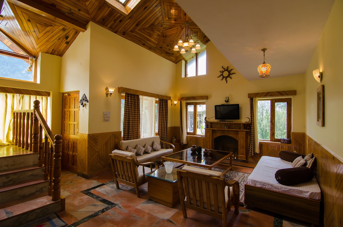 Pata utulivu kwenye Chalet ya Mbao huko Manali, ambapo mazingira tulivu yanakusubiri umbali wa dakika 10 tu kwa gari kutoka kwenye Barabara mahiri ya Maduka. Sebule yetu, iliyo na dari ya kupendeza yenye urefu maradufu na glasi kubwa ya dirisha, iliyooanishwa na meko yenye starehe, imeundwa ili kukushangaza na kukukaribisha kwa uchangamfu. Furahia ukaaji usio na usumbufu na utunzaji wetu wa kila siku wa nyumba usio na doa, mpishi wa ndani anayeandaa milo safi, ya kupendeza na mhudumu aliyefundishwa anayetabasamu aliyejitolea kwa starehe yako.
