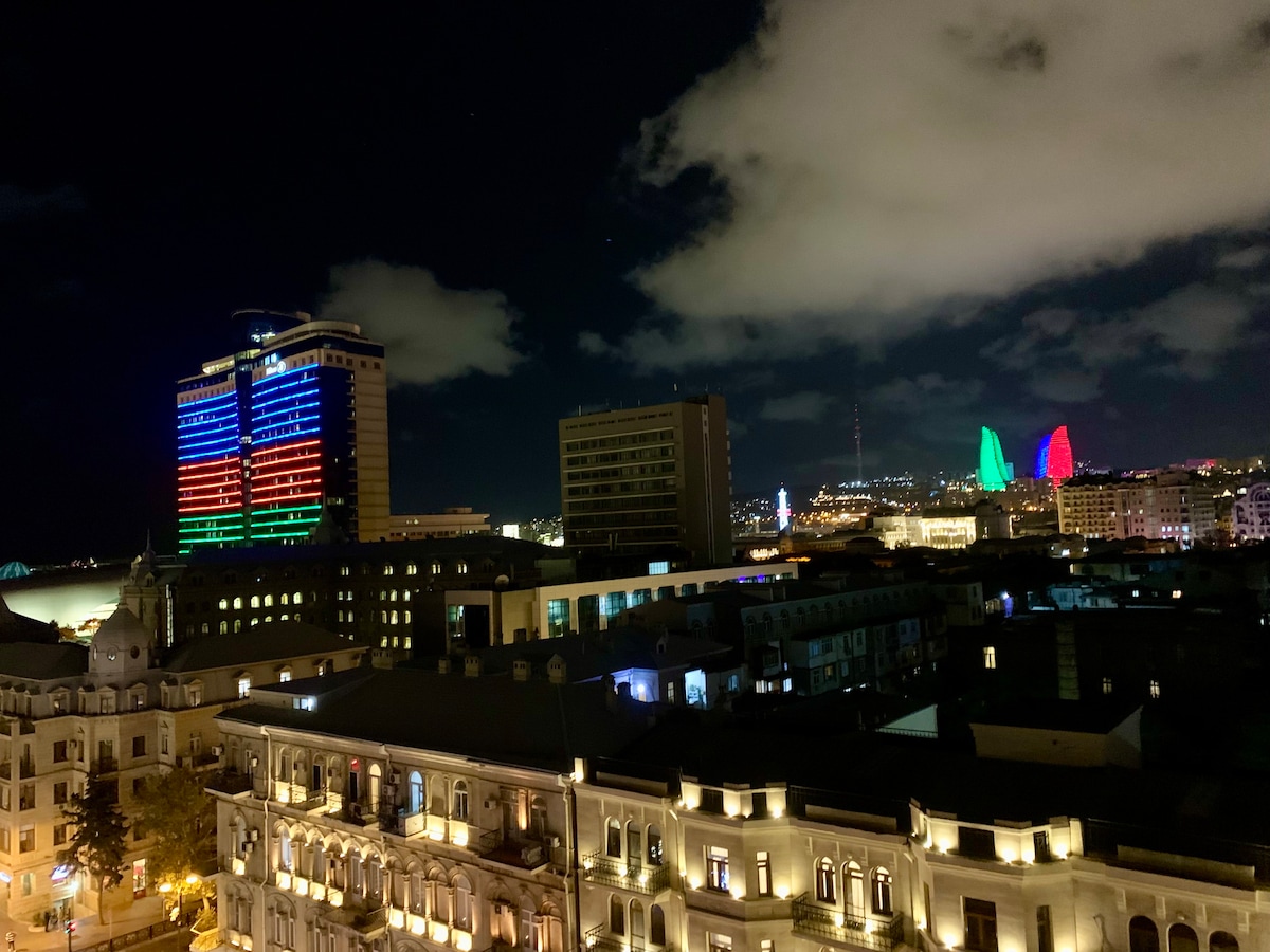 Karibu kwenye fleti yangu maridadi kwenye ghorofa ya 9 iliyo na lifti, iliyo katika sehemu ya kati na ya kifahari zaidi ya Baku. Dakika 2 tu kutoka kwenye Mzunguko maarufu wa Jiji la Baku, umezungukwa na alama-ardhi, hoteli za kifahari, maduka makubwa na mteremko wa ufukweni. Kutoka kwenye madirisha ya panoramic na roshani kubwa utafurahia mandhari ya kupendeza ya Bahari ya Caspian, anga ya jiji, na njia kamili ya Fomula 1 — kana kwamba mbio zinajitokeza chini ya macho yako.