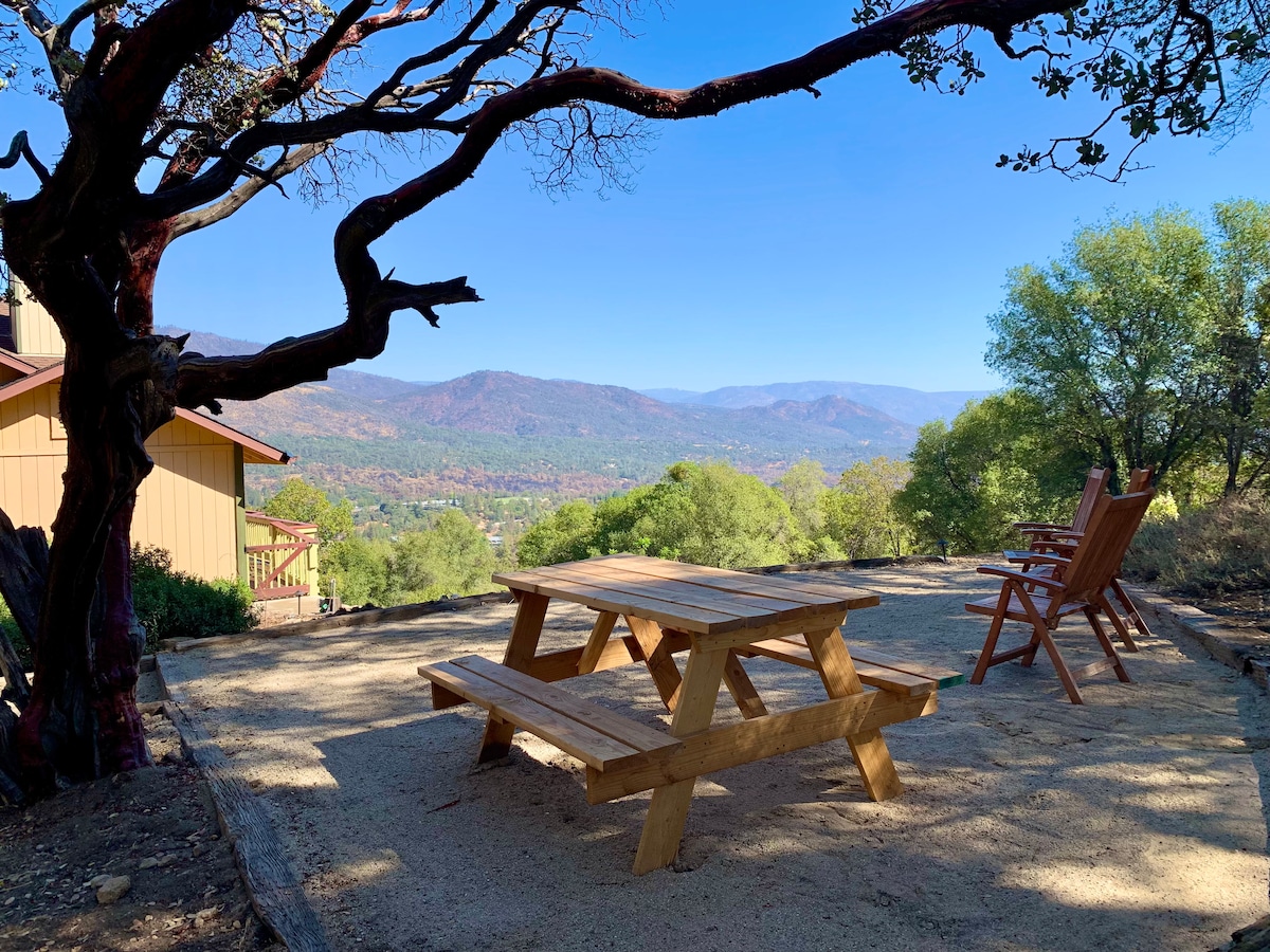 Fikiria mapumziko ya mlimani yenye nyumba ya mbao ya kujitegemea kwenye mlima ulio mbali na mandhari yote yaliyozama katika mandhari, miti, mazingira ya asili huku ukiwa dakika 5 hadi mjini, maduka, maili 17 hadi kwenye mlango wa Yosemite. Mandhari ya kuvutia ya milima ya Sierra Nevada kutoka kwenye sitaha na ndani ya nyumba ya mbao iliyo na madirisha ya ukutani hadi ukutani ambayo yanaalika mwonekano ndani. Pata uzoefu wa maawio ya jua, machweo, mazingira ya asili, kutazama nyota, moto. Nyumba ya mbao inatoa tukio la kipekee! Pumzika, panga upya, na uzame katika mandhari katika mazingira haya ya utulivu, ya kimapenzi.