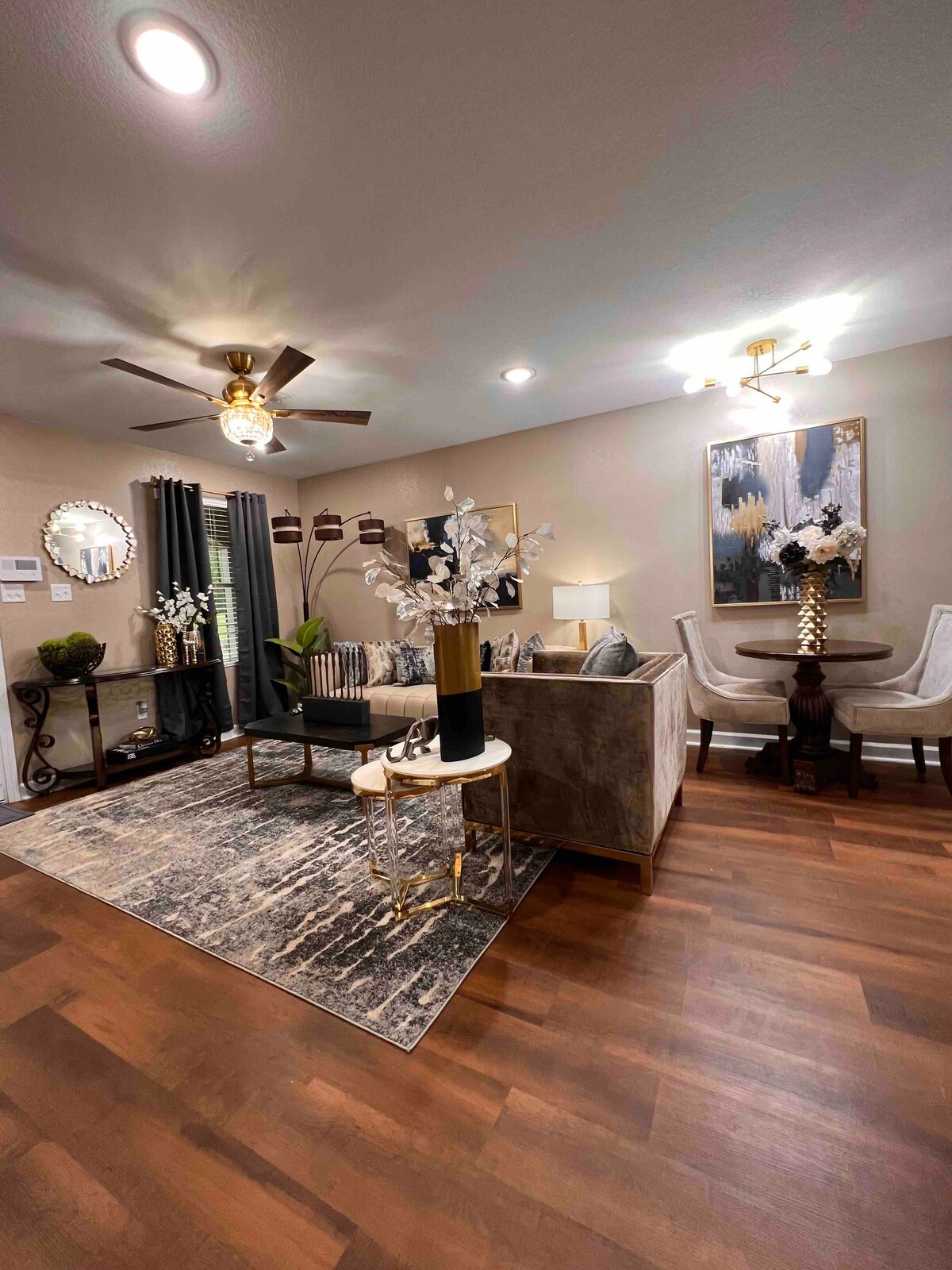 Inafaa kwa Kila Wakati Je, unapanga kuungana tena na familia, mapumziko na marafiki, au safari ya kibiashara? Nyumba yetu yenye nafasi kubwa inakaribisha wageni kumi, ikitoa mazingira bora kwa ajili ya mikusanyiko ya kukumbukwa. Sebule na eneo la kulia chakula huchochea mwingiliano wa kijamii na viti vya kutosha na meza kubwa ya kulia. Furahia baraza letu zuri la ndani, linalofaa kwa hali yoyote ya hewa, linalotoa sehemu tulivu ya kupumzika na kukusanyika. Pata starehe, sehemu na vistawishi ambavyo hufanya ukaaji wako usisahau.