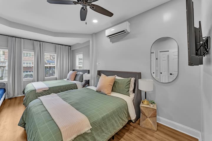 Karibu kwenye Duplex Delight yetu, ambapo uchangamfu wa NYC unachanganyika na utulivu wa pembezoni mwa jiji. Ukiwa katika nyumba mbili zilizotengenezwa kwa ufundi, utagundua sehemu tamu kati ya vivutio vya mijini na mapumziko ya amani. Safari ya treni ya dakika 30 tu inakupeleka katikati ya Manhattan, lakini hifadhi yetu inabaki kuwa mahali pa starehe za kisasa na ubunifu wa karibu. Shirikiana na hali ya nguvu ya jiji wakati wa mchana na ufurahie kukumbatiana kwa utulivu wakati wa usiku. Furahia ofa za jiji, ukijua kila wakati kwamba mapumziko ya kufariji yanasubiri mlangoni pako.