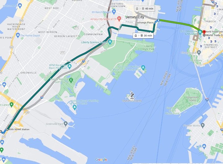 Dakika ✔ 30 kwa Kituo cha Biashara cha Dunia cha Manhattan kupitia treni.