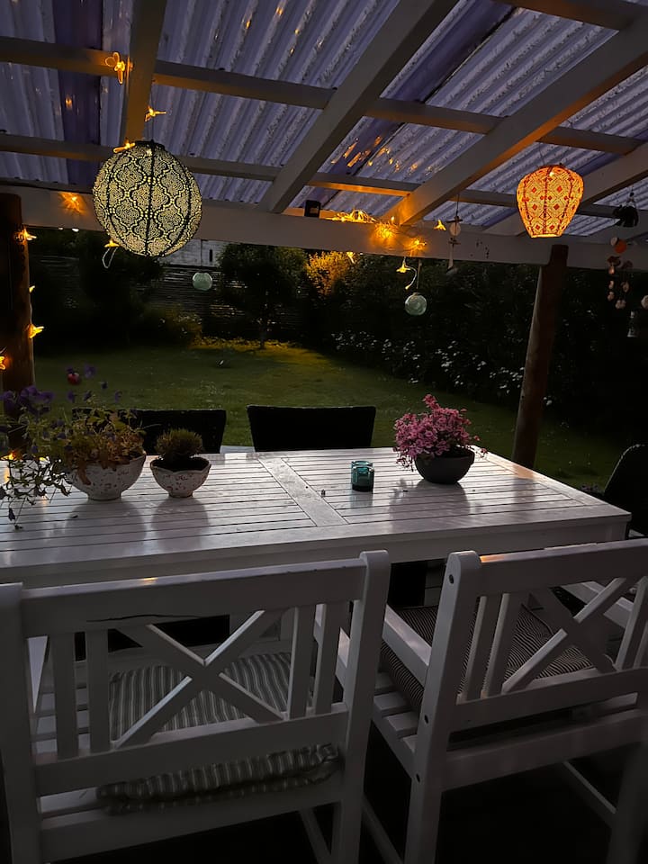 Nyumba yetu ina mwanga na mandhari angavu ya nyumba ya majira ya joto, bustani nzuri yenye matuta 2 mazuri, moja imefunikwa, nyasi kubwa ambapo unaweza kucheza mpira na kucheza. Nyumba imegawanywa katika sehemu ya watu wazima na vijana. Tunasubiri kwa hamu kukukaribisha katika nyumba yetu nzuri na tuna uhakika utafurahia ukaaji wako.