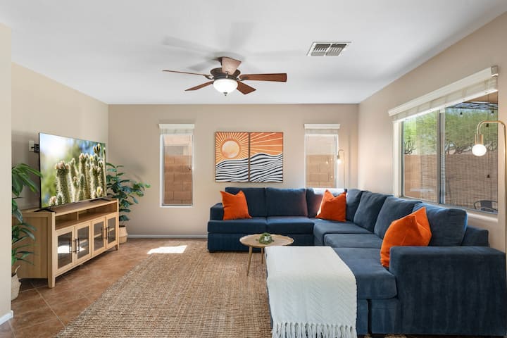 Nyumba kubwa ya familia ya vyumba 4 vya kulala huko North Phoenix karibu na I-17 na Happy Valley, karibu na Anthem, Glendale na Peoria. Imeundwa kwa ajili ya familia na Pack 'n Play, kiti cha juu, kiti cha kuogea cha mtoto na sahani na vikombe vya watoto. Ina vitanda 3 vya King, Queen ya kitambaa, chumba cha michezo chenye foosball na Connect 4, ua laini lenye BBQ na taa za kamba, mapazia ya kuzima mwanga, televisheni za Roku, dawati za ergonomiki, vifaa vya mazoezi, maegesho ya gereji, Wi-Fi ya kasi, na ufikiaji rahisi wa Desert Ridge, TSMC, na maeneo ya mazoezi ya spring.