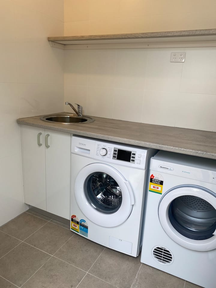 ● Mashine ya kufulia, mashine ya kukausha na laini ya nguo ya nje. Hifadhi ya nguo iliyo na ubao wa pasi/chuma na viango.