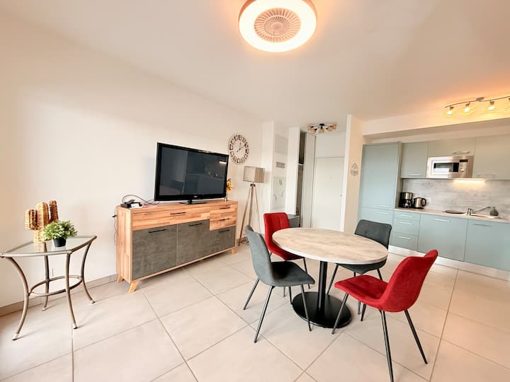 Malazi haya mapya na maridadi yanatoa mojawapo ya maeneo bora zaidi huko Cap d'Agde yenye mandhari ya kipekee. Inafaa kwa ajili ya kukaa kama wanandoa, familia, kufanya kazi kupitia simu au kufurahia likizo kando ya bahari katika fleti ya kifahari.