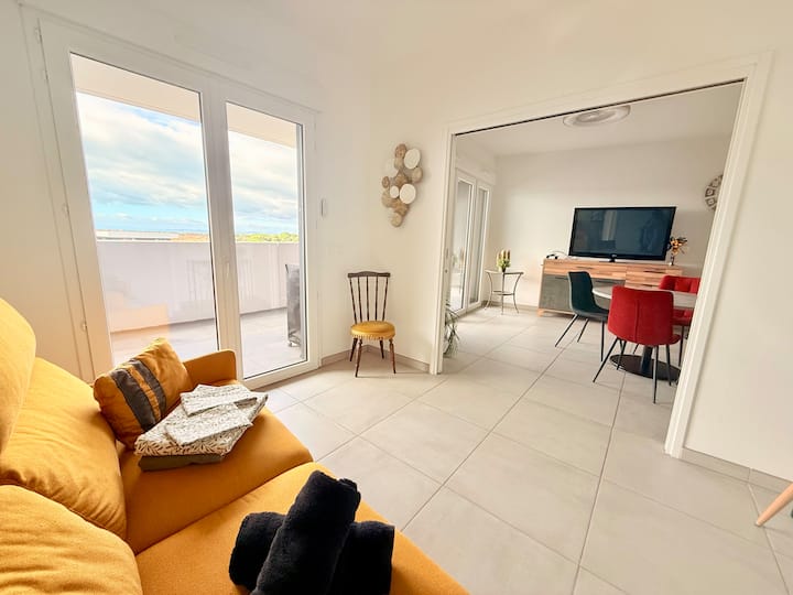 🌅 TARASI YA M² 25, ikiwemo eneo la kulia na eneo la kupumzika. Utafurahia mandhari ya kuvutia ya Pyrenees na Bahari ya Mediterania.