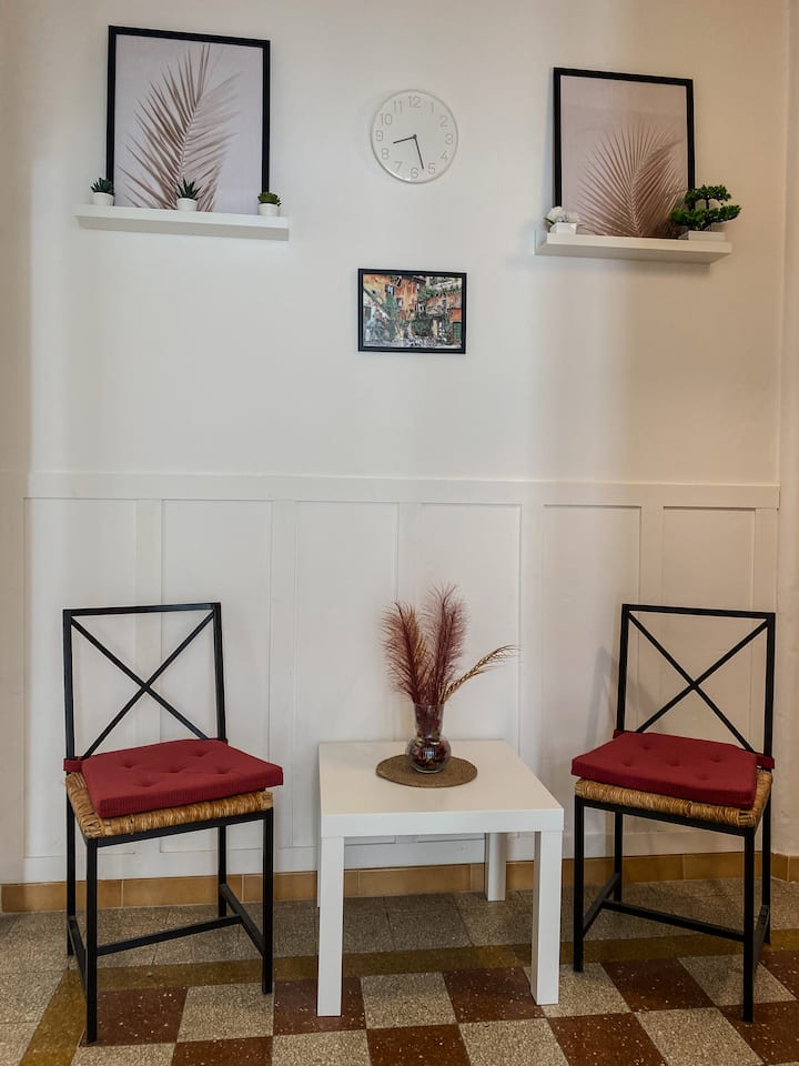Kwenye mlango, kuna eneo dogo la kukaa lenye meza yenye viti viwili, na kuunda kona yenye starehe ambapo unaweza kupumzika, kuzungumza, au kufurahia kikombe cha kahawa. Meza imepambwa kwa kitovu rahisi lakini cha kifahari ambacho kinaongeza mguso wa rangi na mtindo kwenye mazingira.