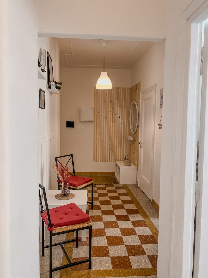 Fleti hiyo ina sifa yake ya kipekee na sakafu ya kale ambayo imeunganishwa kwa ustadi katika muundo wa jumla wa nyumba.