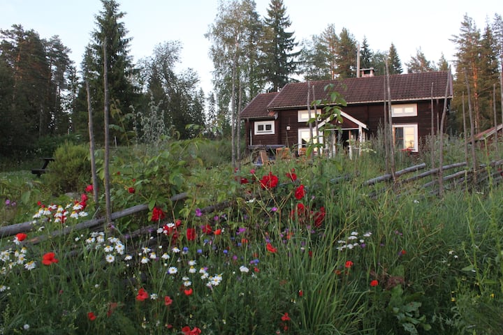 Malazi ya kipekee katika mazingira mazuri, ya kijijini, ya zamani ya nyumba ya logi kwa wale ambao wanataka amani na utulivu na maoni mazuri ya msitu na ziwa. Nyumba ya karne ya 19 ina vyumba viwili (kimoja kwenye ghorofa ya chini na kimoja kwenye ghorofa ya juu) na jiko. Imeandaliwa kikamilifu kwa ajili ya maisha ya starehe mwaka mzima. Mazingira ya ajabu. Ufikiaji wa sauna na beseni lake la maji moto mbele ya nyumba. BBQ nzuri kwenye mto ulio karibu.