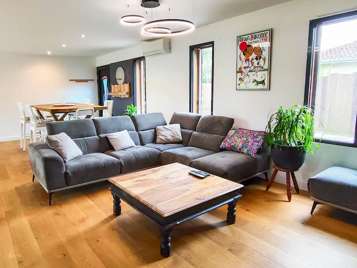 Mchanganyiko wa nyumba kubwa na jengo la nje. Inafaa kwa likizo nzuri ya vitamini, karibu na ufukwe na maduka, huku ukidumisha nafasi ya juu na faragha.