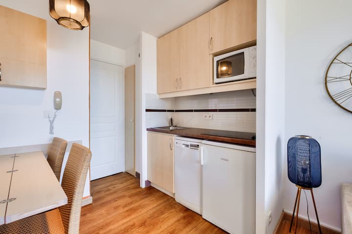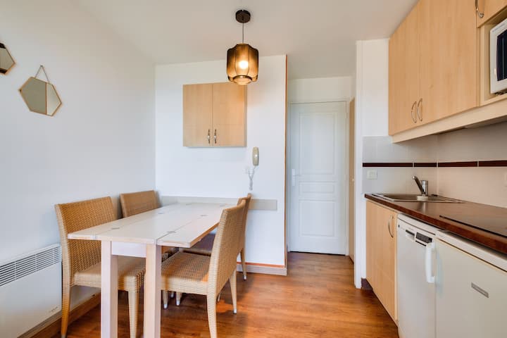 Unaweza kufurahia bwawa zuri la kuogelea lisilo na kikomo la makazi (viti vinapatikana - haisimamwi na maeva lakini na kampuni ya nje - kwa kuongezea, bei zinazoweza kutafutwa kwenye eneo, bwawa la kuogelea lisilo na joto limefunguliwa kuanzia tarehe 4 Aprili hadi tarehe 2 Novemba) na ufukwe ulio umbali wa mita 800.