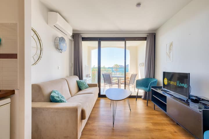 Faida za upangishaji wako: Fleti ya mwonekano wa bahari, inayoangalia Kusini-Magharibi, iliyo katikati ya mji, karibu na bahari na shughuli, iliyo na bwawa la kuogelea ndani ya makazi, maegesho, Wi-Fi, kiyoyozi, roshani.