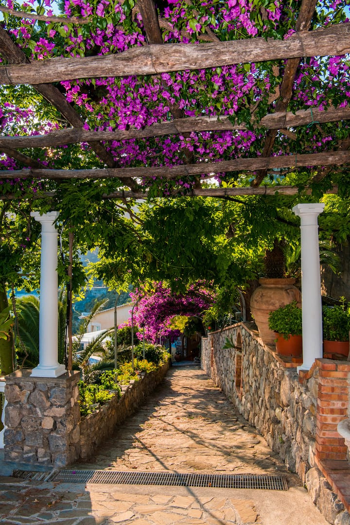 Jina la fleti hiyo linatokana na mtaro wake mzuri wa kujitegemea unaoangalia kisiwa cha kupendeza cha Li Galli na mji wa kupendeza wa Positano. Ikizungukwa na msitu wa misonobari wenye harufu nzuri ambao unaenea hadi kwenye bahari inayong 'aa, mtaro huo ni mahali patakatifu tulivu ambapo mazingira ya asili na vistas za kupendeza huungana kwa maelewano kamili.