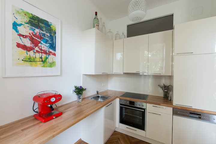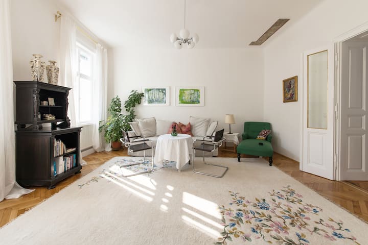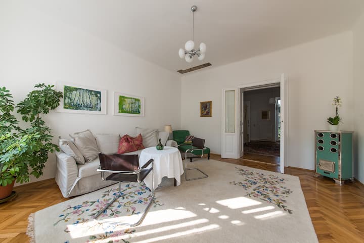 Fleti iko katika Penzing (wilaya ya 14), eneo tulivu la makazi, katika jengo safi la kihistoria kwenye ghorofa ya 2 lenye mwonekano wa bustani kubwa yenye miti ya zamani. Karibu na "Schönbrunn Palace", mojawapo ya maeneo maarufu zaidi ya UNESCO ulimwenguni - mahali pazuri pa kupumzika na kuwa mahali pa kuanzia kwa ajili ya kutazama mandhari huko Vienna. Vifaa: Fleti ina ukubwa wa m² 70 na ina chumba 1 cha kulala chenye kitanda mara mbili, sebule 1 kubwa iliyo na kochi la kuvuta, jiko lenye vigae, bafu la kisasa, WC, jiko lenye vifaa kamili lenye roshani inayoangalia bustani. Fleti hiyo ina teknolojia ya kisasa ya nyumba na starehe ya juu na vipengele vya kawaida vya jengo la Vienna la karne ya 19.