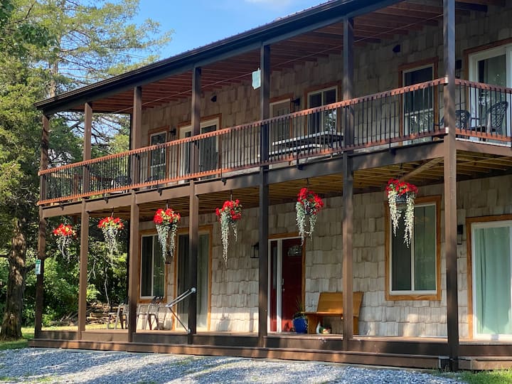 Wageni wako huru kutumia eneo la pamoja kwenye ngazi ya pili na sitaha. Kijito kinapita kwenye nyumba na wageni wanakaribishwa kukifurahia. Kuna eneo la malisho/ pikiniki upande wa pili wa kijito ambapo wageni wako huru kuchunguza. Upande wa mashariki wa nyumba kuna uwanja wa mpira wa kikapu/pickleball ambao unaweza kutumika