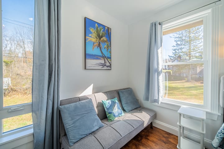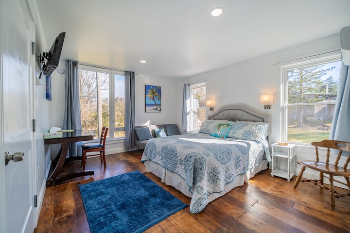 Chumba cha Pwani, kilicho kwenye kona ya kaskazini magharibi ya ghorofa ya pili, kina mlango wa kioo unaoteleza ambao unafunguka kwenye roshani ya ghorofa ya pili. Madirisha mawili ya ziada makubwa huangaza chumba. Ina bafu lake la kujitegemea na kabati la nguo. Ina kitanda aina ya queen, dawati/kiti na televisheni mahiri.