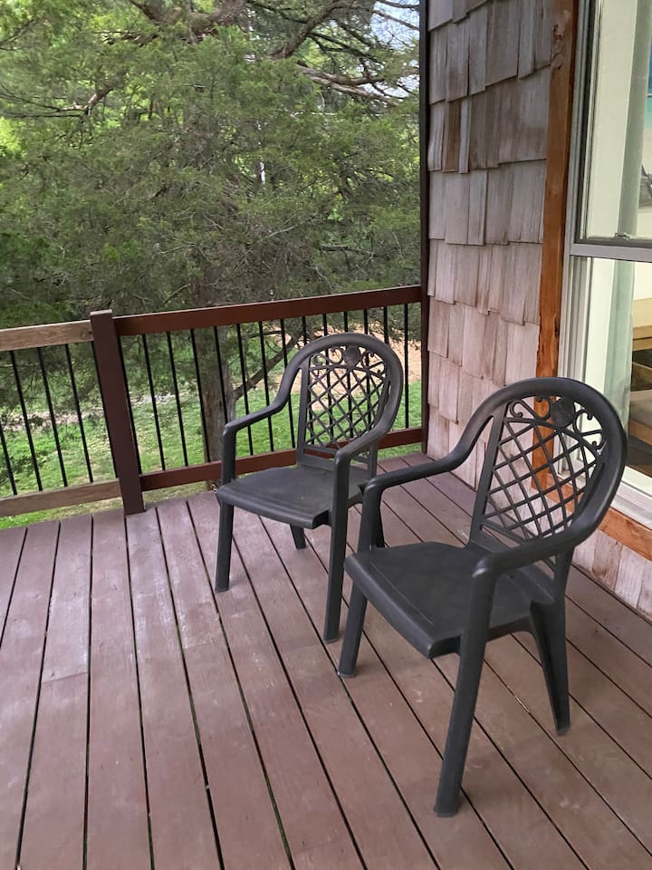 Kuna vyumba viwili vya kulala kwenye ngazi kuu ya Cedar Spring Oasis. Kama ilivyoelezwa hapo awali, chumba cha kwanza kitakuwa Chumba cha Brookside. Ina mlango wa kujitegemea kutoka kwenye chumba, na pia ina mlango kutoka kwenye chumba kizuri. Ina bafu na kabati la kujitegemea. Ina kitanda aina ya queen, kiti cha kutikisa, kabati la kujipambia na kitanda pacha. Magodoro mawili mawili ya ziada yako chini ya kitanda pacha. Chumba cha Brookside kina mlango wa kioo unaoteleza kwenye sitaha ya chini ya nyumba. Madirisha mawili ya ziada makubwa huwezesha jua la alasiri kuangaza na kupasha joto chumba. Inatoa hisia ya kushangaza ya kupitia mandhari ya nje-lakini iko katika mazingira yanayodhibitiwa na hali ya hewa.