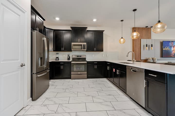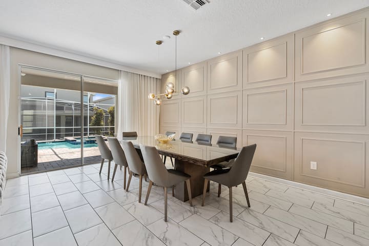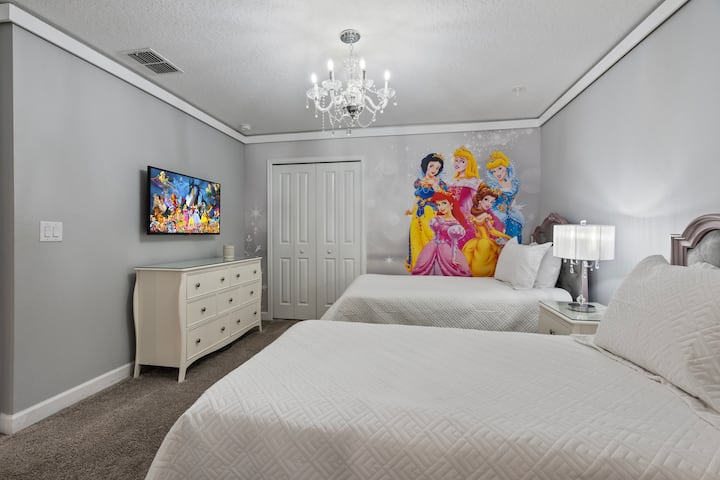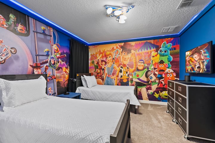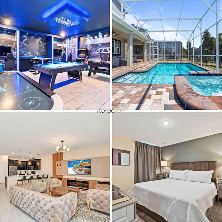 Vila hii ya kifahari katika Champions Gate Resort ina vyumba 9 vilivyopambwa vizuri na mabafu 5, na inaweza kukaa hadi wageni 24. Kwenye ghorofa ya kwanza, kuna vyumba viwili vya kulala vya king, ikiwemo chumba kikuu cha kulala chenye bafu la kujitegemea lenye bomba la mvua na beseni la kuogea na chumba kingine cha kulala cha king chenye bomba la mvua la kujitegemea. Ghorofa ya pili ina mchanganyiko wa vyumba vya kulala vyenye mandhari na vipana, ikiwemo chumba cha mapacha chenye mandhari ya Hadithi ya Toy, chumba chenye mandhari ya Marvel chenye vitanda viwili kamili, chumba cha mapacha chenye mandhari ya Princess, chumba chenye mandhari ya Mickey chenye vitanda vitatu kamili na vyumba kadhaa vya kulala vya king. Mabafu ya Jack-and-Jill huunganisha vyumba fulani kwa urahisi, na kutoa starehe na utendaji. Vila pia inajumuisha chumba cha mchezo chenye mandhari ya Star Wars, na kuifanya iwe bora kwa familia na makundi yanayotafuta mapumziko na burudani.