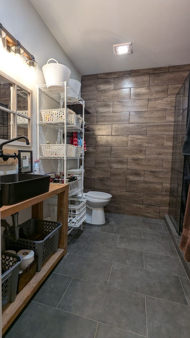 "Pitia chumba cha kufulia na ufungue mlango wa eneo zuri sana kiasi cha kuchukua #2. Bafu hili la ghorofa ya juu lina choo chenye vyoo viwili vinavyofaa mazingira, beseni dogo jeupe zuri kwa ajili ya mabafu yote ya kufurahisha ya kiputo na ukubwa mzuri, ubatili wa kijivu ulio na makabati ya kuhifadhi na sinki nyeupe ya juu iliyo na bomba jeusi. Vipande vya rangi vinakufanya uhisi kama mtoto tena, ili ufurahie wakati wa kuoga!"
