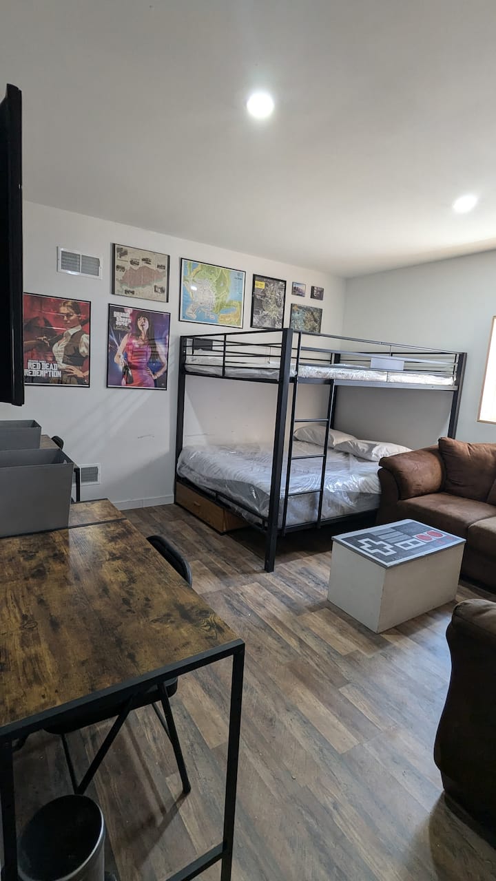 "Cheza michezo mchana kutwa na usiku kucha katika chumba hiki cha aina yake kilichojaa hatua, msisimko na shughuli! Utafurahia sana, hivi kwamba huenda hata usitumie vitanda vya 2 Queen size Bunk. Lakini tunajua utapenda kucheza mchezo unaoupenda kwenye televisheni zote mbili za 40"zilizowekwa kwenye ukuta. PlayStation, XBOX, Windows, Mac, au mfumo wowote unaochagua. Sofa kubwa ya sehemu ya kahawia ina hadi watu 6. Madawati 2 ya michezo ya kubahatisha, kamili na viti, koni za michezo, mfumo wa spika unaobadilika rangi na mgawanyiko wa HDMI, hukupa udhibiti kamili wa hatua!"