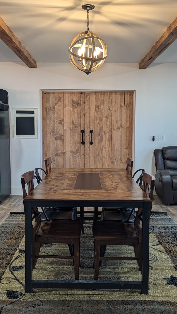 Unapoingia kutoka kwenye chumba cha kulala hadi kwenye nyumba ya sanaa, unaona fremu mbele yako, chandelier ya kijijini inayoning 'inia kwa neema katikati ya nyumba, juu ya meza ya kulia ya miguu ya futi 8, iliyozungukwa na viti 8.