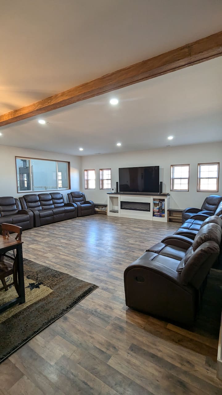 Kuna kiti kwa ajili ya kila mtu, kwa hivyo pakia familia na marafiki wako wote. Sebule hii inaweza kupangwa kwa njia mbalimbali ili kufaidika zaidi na tukio lako. Seti yetu ya ngozi ya rangi ya hudhurungi ya kijani inajumuisha: viti 2 vya mikono, 2 Loveseats na Sofa 2, viti vina hadi watu 12! Weka benchi 2 za meza nyeusi na uwe na kiti na blanketi kwa ajili ya kila mtu!