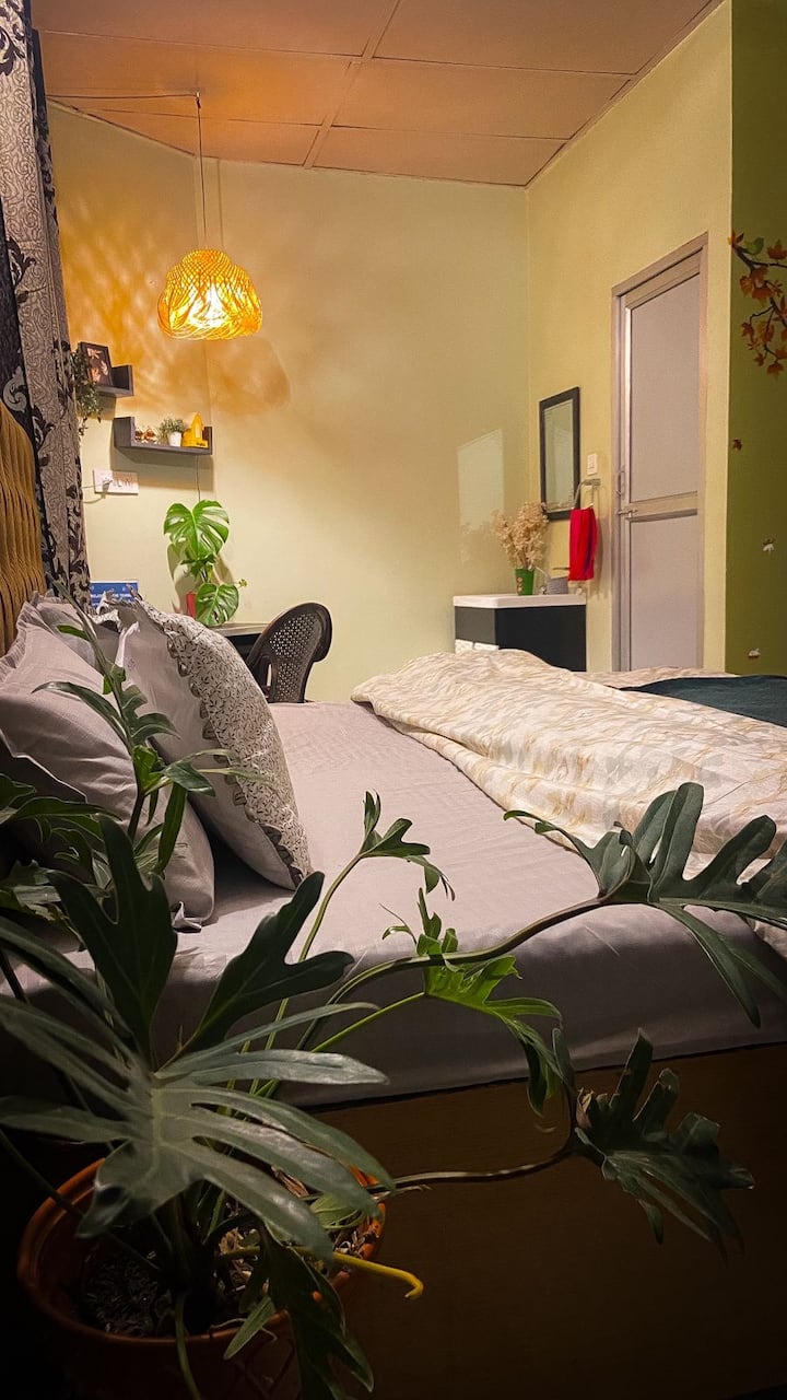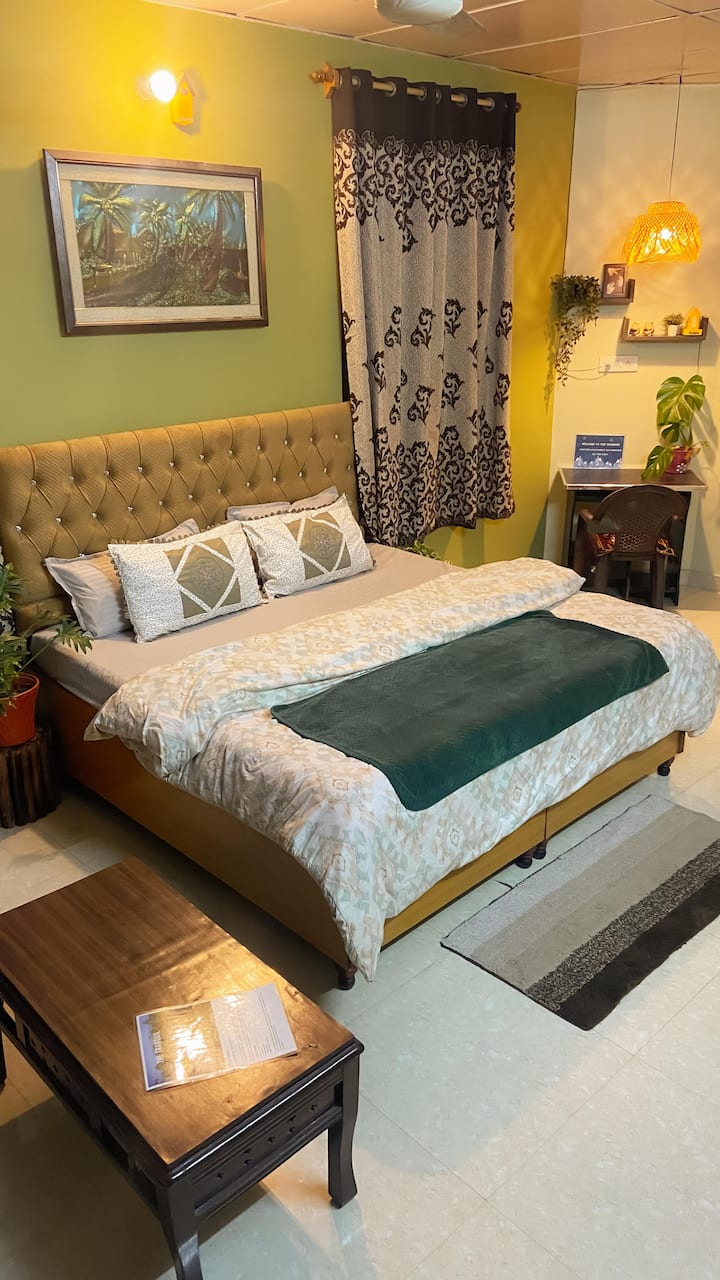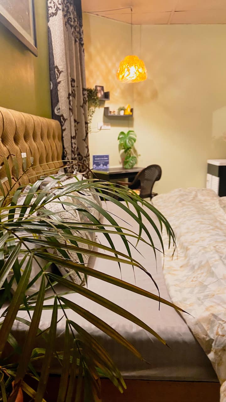 Chumba hicho pia kina bafu la kujitegemea na pamoja na jiko moja linalofanya kazi kikamilifu ambalo hukusaidia kuweka chakula kizuri cha moto pamoja, kwamba, unatarajiwa kununua mboga wewe mwenyewe. Baadhi ya vistawishi jikoni ni sehemu ya juu ya jiko la gesi, sufuria na vikaango, crockery, na vyombo vya kulia nk. Kutokana na hali ya kujihudumia ya malazi, utatarajiwa kuleta au kununua vifaa vyako mwenyewe kuanzia sasa na kuendelea. Maduka makubwa ya ununuzi na idadi kubwa ya maduka ya vyakula yanayotoa vitu vinavyohitajika kila siku ni umbali wa dakika 10 kutoka kwenye nyumba. Soko la mboga liko kwenye kichwa cha barabara, dakika 5 kutoka kwenye nyumba. Sasa unaweza pia kufurahia Ukumbi wetu mpya uliojengwa karibu na chumba chako cha kulala bila malipo yoyote ya ziada.