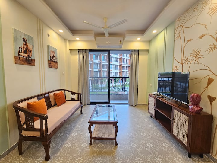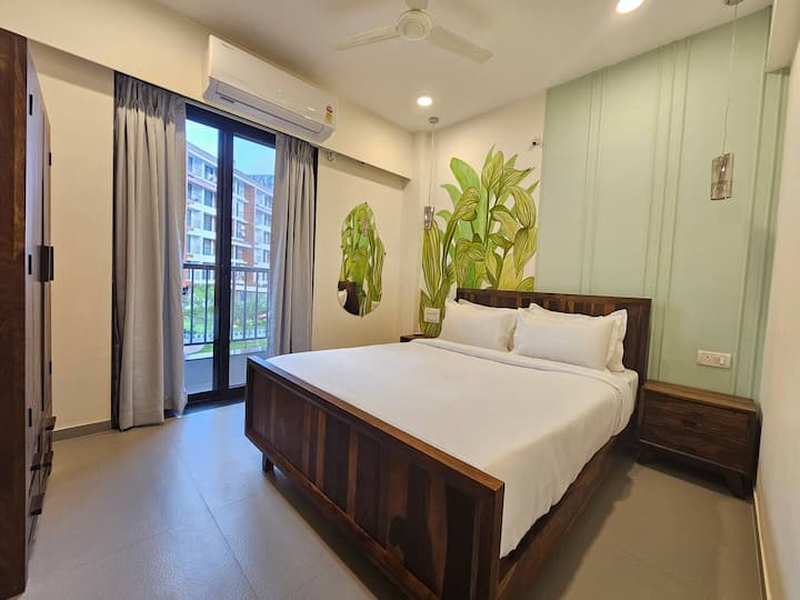 1BHK ya Kisasa huko Candolim | Bwawa + Dawati la Kazi | C110