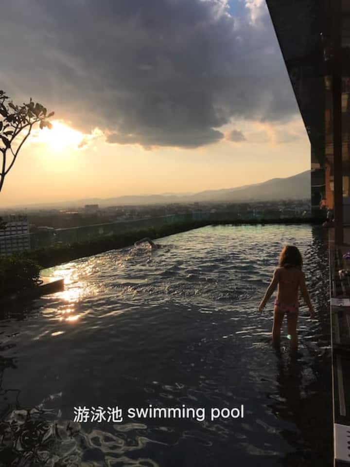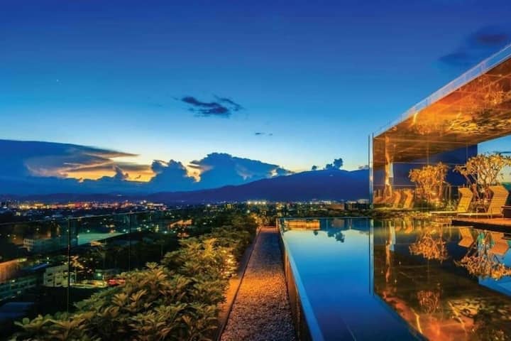 10-1) Kituo cha jiji cha Chiang Mai, karibu na hoteli ya Shangri-La, fleti mahususi ya vyumba viwili vya kulala, w/bwawa la bila malipo, kondo ya astra ya mazoezi
