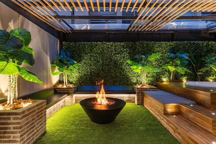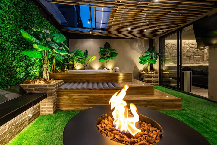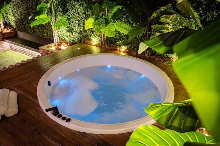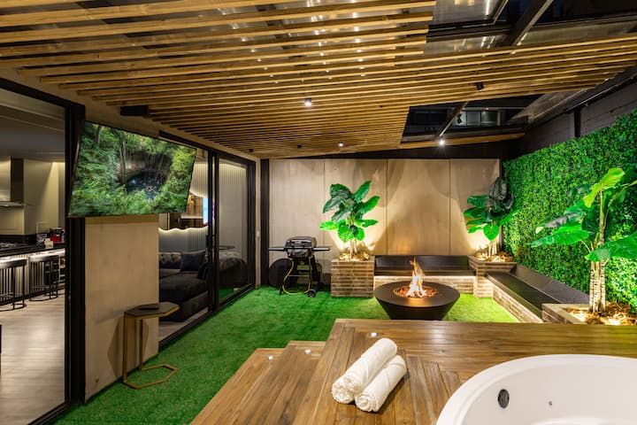 Eneo la Kujitegemea lenye nafasi kubwa: Likiwa na jakuzi yenye joto lenye mfumo wa kitaalamu wa upasuaji wa maji na taa za LED zinazofaa kwa ajili ya kupumzika na mshirika wako au marafiki. Mtaro huo pia unajumuisha televisheni ya hali ya juu ya inchi 65 ya 4K, inayofaa kwa ajili ya kufurahia sinema, mfululizo, au hafla za michezo kutoka kwenye jakuzi au eneo maridadi la meza ya moto, zote zikiwa zimezungukwa na ubunifu wa kifahari uliohamasishwa na kiini cha msitu wa mvua wa Amazon.