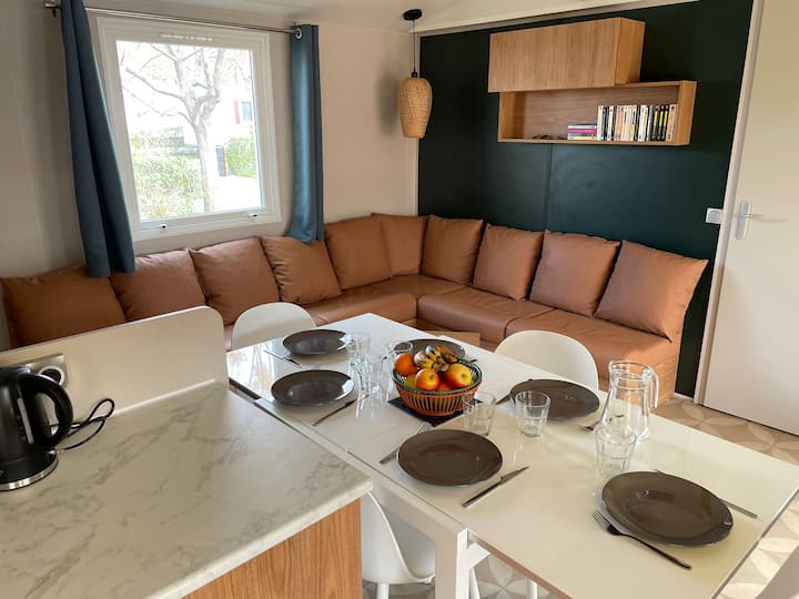 Vistawishi: Runinga , mikrowevu, oveni, hob ya gesi 4, mashine ya kuosha, toaster, mashine ya kuosha vyombo, kiyoyozi, koni ya umeme, mashine ya kutengeneza kahawa, birika, friji kubwa, vifaa vya kupikia na vyombo, betri ya kupikia, mapazia ya kuzima ya chumba cha kulala, sofa ya kona inayoweza kubadilishwa, fanicha ya bustani, meza ya ndani na nje kwa ajili ya watu 8 na vitanda 2 vya jua.