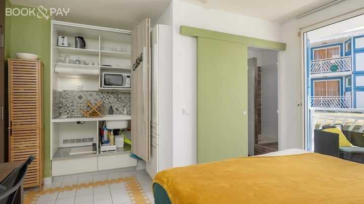 Studio ya Cannelle, iliyo na kiyoyozi kamili, yenye eneo la m² 20, inaweza kuwatoshea wageni 2 kwa urahisi. Studio iko katikati ya makazi ya Manganao huko Saint-François.
