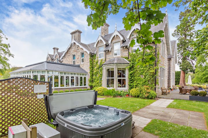 Siku za joto, nenda kwenye patio na uangalie mandhari ya Hifadhi ya Kitaifa ya Cairngorms. Kuna barbeque kwa alasiri zenye jua na mahali pa moto kwa jioni zenye baridi. Nyota zinapoonekana, ongeza champagne yako na upumzike kwenye beseni la maji moto. Baadaye, vyumba kumi na moja vya kulala vyenye mandhari ya Uskoti, kila kimoja kikiwa na bafuni ya kifahari, vinaahidi usingizi mzito na wa utulivu.