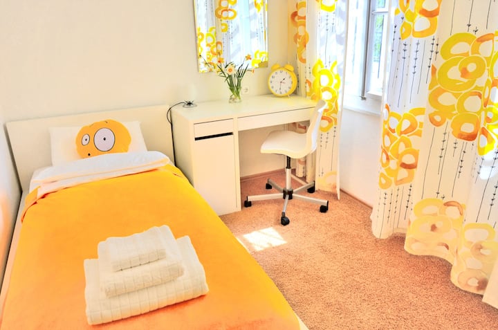 Chumba hicho kiko kwenye ghorofa 1 na kina kitanda kimoja (90x200) kilicho na godoro la mifupa lenye starehe na mito ya povu la kumbukumbu, taulo, kabati la nguo, meza, kiti na kioo. Kuna mashine ya kukausha nywele pia.
