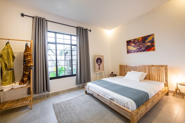 Pata starehe katika chumba hiki kikuu cha kulala kilicho katika eneo tulivu la Kibagabaga la Kigali. likiwa na kitanda cha ukubwa wa kifalme kilicho na mashuka yenye ubora wa juu, kuhakikisha usingizi wa usiku wenye utulivu. Chumba kimeoga katika mwanga wa asili, na mapazia ya kuzima kwa ajili ya faragha iliyoongezwa. Bafu la chumbani linatoa tukio kama la spa lenye bafu la mvua, vifaa vya usafi wa mwili vya kifahari na vitambaa vya kuogea. Karibu na maeneo maarufu ya Kigali na mikahawa, chumba hiki kikuu cha kulala ni mapumziko yako bora.