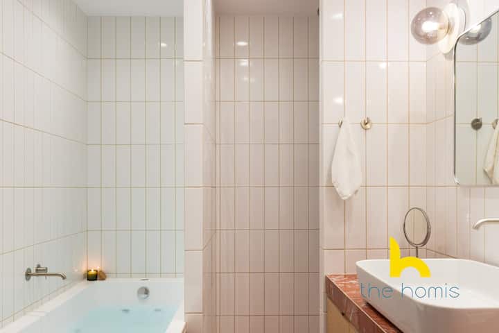 Chumba kikuu cha kulala kina bafu la kujitegemea, sehemu iliyoundwa vizuri iliyo na vigae vya kifahari vya sakafu hadi dari na bafu la kisasa la juu la mvua. Ubatili, pamoja na muundo wake wa mviringo na vigae vya kijani kama marumaru kwenye sakafu, huongeza mguso wa kifahari, na kufanya utaratibu wako wa asubuhi uonekane kama kipindi cha kupiga mbizi.