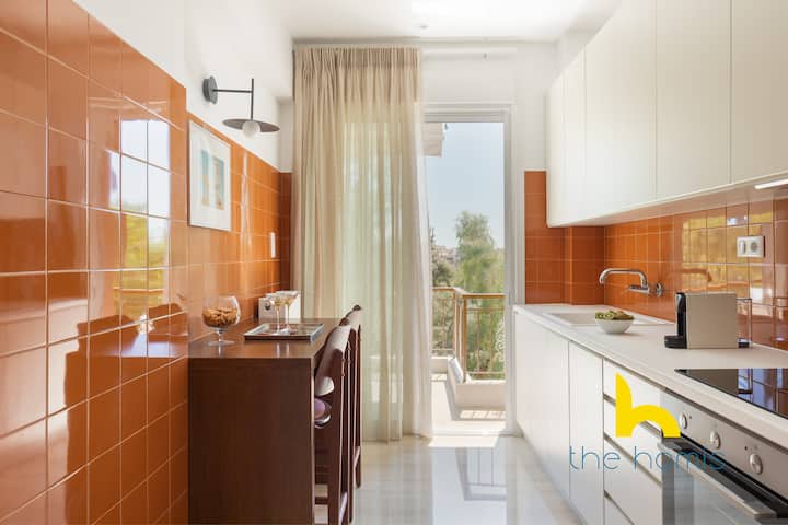 Ingia katika ulimwengu wa uzuri ulioboreshwa na starehe ya kisasa katika fleti hii nzuri ya ubunifu, iliyo kwenye ghorofa ya tatu katika eneo la amani la Zografou. Unapoingia, unasalimiwa mara moja na sebule iliyochangamka, ambapo kila kitu kimepangwa kwa uangalifu ili kuunda mazingira ya kuvutia na ya kifahari. Kukiwa na madirisha makubwa yanayotengeneza mandhari ya bustani ya kupendeza, sehemu hii inaoshwa kwa mwanga wa asili mchana kutwa, na kuifanya iwe mahali pazuri pa kupumzika na burudani.