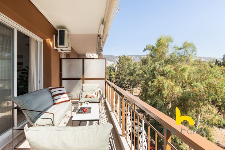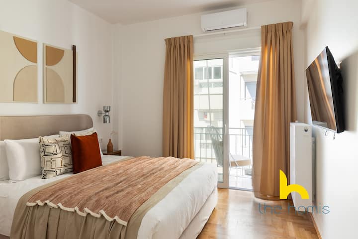 Vyumba viwili vya kulala vya fleti ni hifadhi za kweli za starehe. Kila moja ina kitanda cha King kilichotengenezwa mahususi chenye godoro la ubora wa juu, kuhakikisha usingizi wa usiku wenye utulivu. Vyumba vya kulala vimebuniwa na sehemu ya kutosha ya kabati, ikikuwezesha kufungasha na kukaa kwa urahisi, na kufanya hili kuwa chaguo bora kwa ukaaji wa muda mrefu. Vyumba vyote viwili vinaweza kufikia roshani, ambapo unaweza kuanza siku yako kwa hewa safi na sauti ya ndege kutoka kwenye bustani ya karibu. Burudani iko mikononi mwako na televisheni mahiri katika vyumba vyote viwili vya kulala, bora kwa ajili ya kupumzika na vipindi unavyopenda kwenye Netflix baada ya siku moja ya kuchunguza Athens.