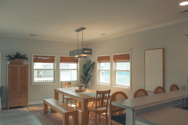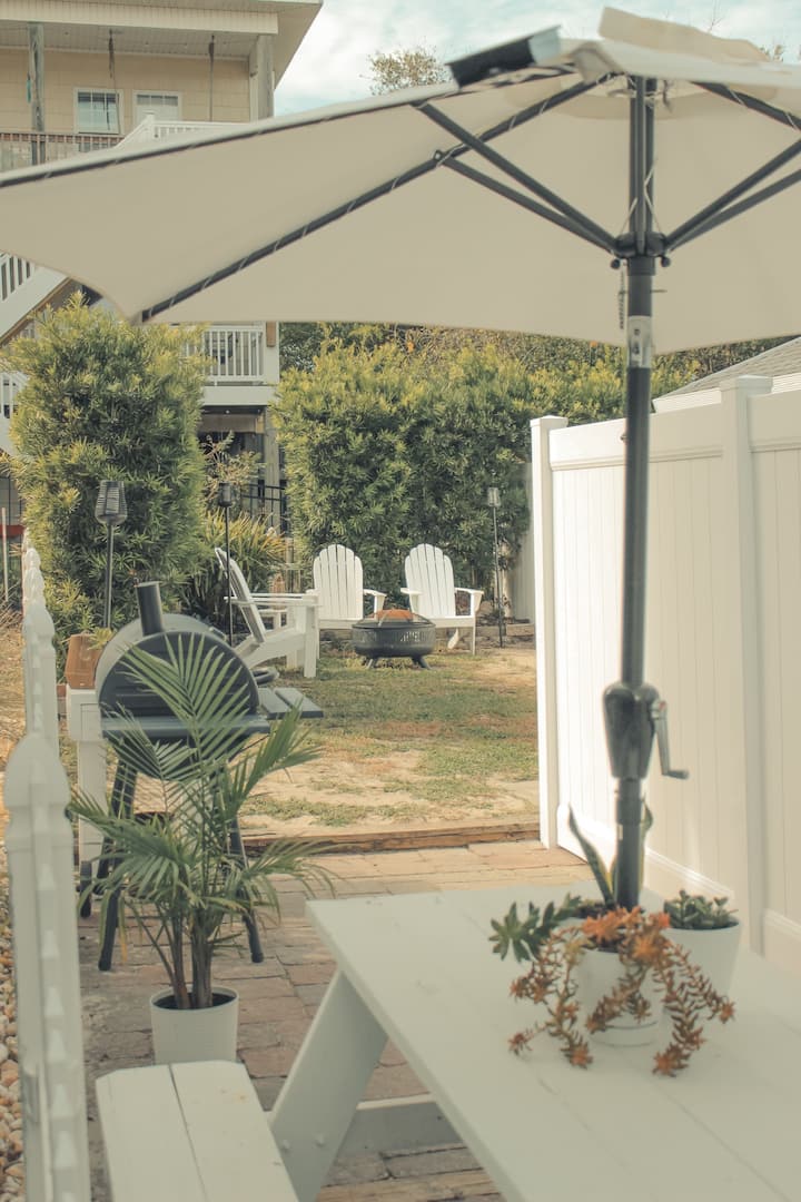 Hakuna njia bora ya kuteleza kwenye mavazi ya polepole kuliko kushuka kwenye kochi la nje lenye starehe linaloangalia bahari baada ya siku ndefu ya kutembea kwenye jua kwenye pwani ya Carolina iliyo mtaani. Ikiwa unatamani chakula safi kilichopikwa nyumbani, Sempre Blu A ina jiko lenye vifaa kamili ikiwa ni pamoja na mahitaji yote ya msingi ya kupikia utakayohitaji pamoja na baa ya kahawa iliyo na mashine ya kutengeneza kahawa ya kikombe cha k na mashine ya kutengeneza kahawa ya matone. Pia tunatoa jiko la kuchomea nyama lililo kwenye baraza la ua wa nyuma pamoja na meza ya pikiniki iliyo na mwavuli, kiti maridadi cha yai na shimo la moto lililozungukwa na viti vinne vya nje. Sehemu ya kuhifadhi iliyo chini ya ngazi inayoelekea kwenye mlango wa mbele wa Sempre Blu A itajumuisha viti 6 vya ufukweni, mwavuli 1, jokofu 1, mbao za shimo la mahindi na michezo anuwai ya ufukweni.