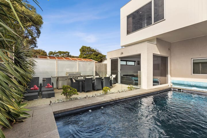 Gundua anasa safi katika nyumba hii ya kupendeza ya mjini huko Ocean Grove. Ikiwa na vyumba 5 vya kulala vyenye nafasi kubwa, mabafu 3, mtaro wa paa wa kujitegemea na mandhari ya kuvutia ya bahari ya digrii 180 kutoka mnara wa taa wa Point Lonsdale hadi Barwon Heads Bluff, hapa ni mahali pazuri kwa likizo yako ya pwani. Furahia bwawa linalong 'aa, baraza la jua la alfresco, jiko la mbunifu, meko ya starehe na kadhalika. Ina nafasi ya wageni 10. Hakuna Sera ya Sherehe - Vikomo vikali sana vya kelele vinatumika.