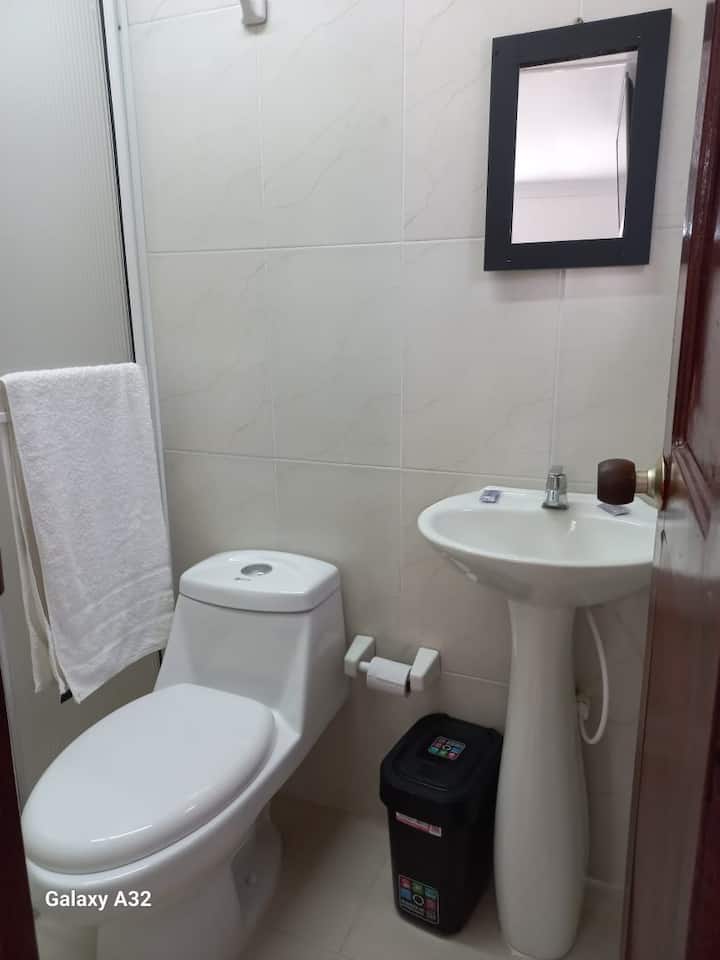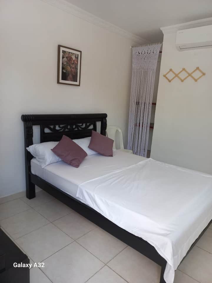 Chumba, bafu ya kibinafsi, kitanda cha watu wawili, kitanda cha ghorofa (kitanda cha shambani) kilicho na kitanda cha msaidizi, A/C, WiFi, runinga janja, friji ndogo, eneo la kufulia lenye mashine za kuosha na jikoni.