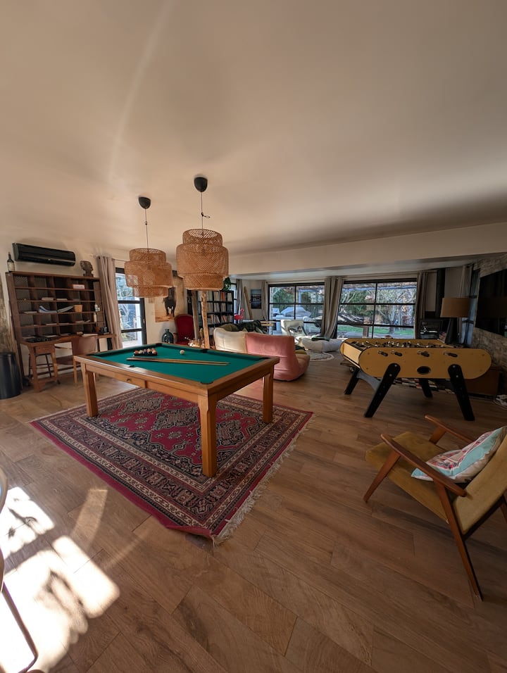 Nyumba ya bwawa ya m² 40 inajumuisha baa, meza ya bwawa, mishale, baiskeli ya mviringo na sebule.