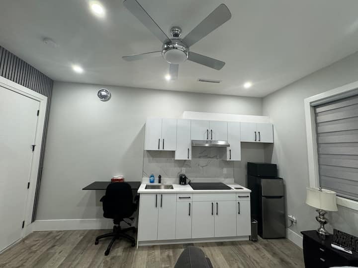 Chumba kipya cha Wageni chenye starehe chenye sehemu ya kufanyia kazi na baraza