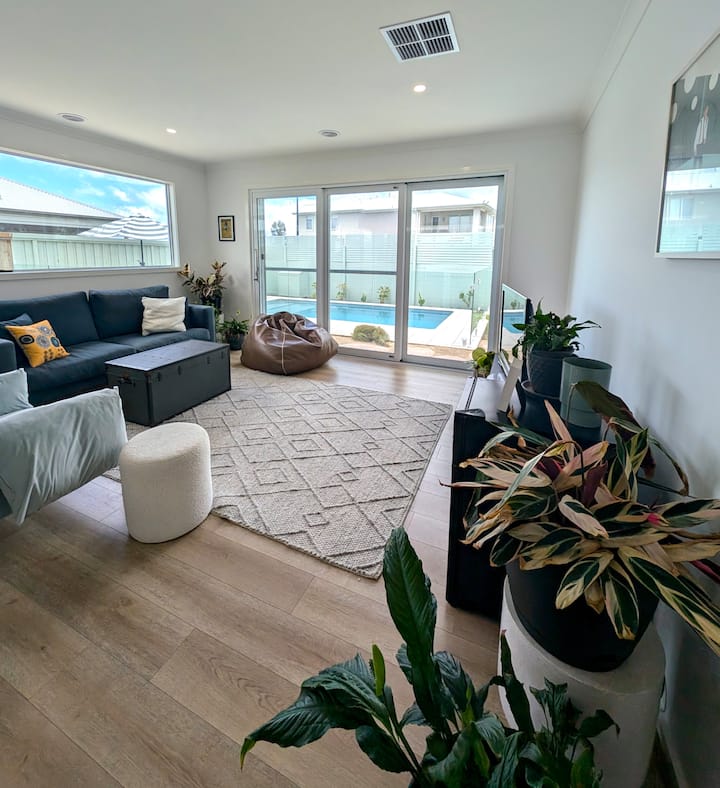 Point Lonsdale kwenye Rasi ya Bellarine. Mapumziko haya ya maridadi, yenye nafasi ya vyumba 3-4 vya kulala, bafu 2.5 ni likizo bora kwa familia na marafiki wanaotafuta mapumziko na jasura. Furahia mabadiliko ya maisha ya ndani na nje bila usumbufu kutoka kwenye bwawa la ajabu na eneo la mapumziko, hadi sebuleni na mahali pa moto pa ndani na eneo la burudani la nje, yote yakiwa yamezungukwa na bustani iliyopangwa vizuri.