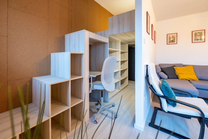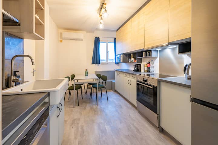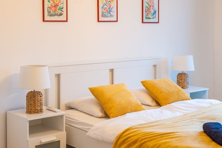 Iko kwenye ghorofa ya 5, nyumba hii angavu na yenye jua imejaa mwanga wa asili mchana kutwa. Inatoa mazingira ya kweli ya "nyumbani mbali na nyumbani". Ikiwa na vyumba viwili tofauti vya kulala, sebule yenye nafasi kubwa, eneo mahususi la kazi, jiko lenye vifaa kamili, bafu lenye WC, choo tofauti cha ziada na kabati la nguo, fleti hutoa starehe na nafasi kwa familia au marafiki.