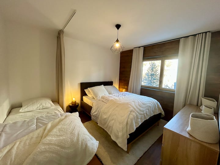 Karibu kwenye nyumba yetu ndogo yenye starehe. Nyumba mpya ya vyumba 2 kwenye ghorofa ya 1, LES CLAUX mita 150 kutoka kwenye miteremko. Sebule iliyo na kitanda cha sofa (140x200) na jiko lenye vifaa Marekani, chumba cha kulala (kitanda 140x200 na kitanda 90x200), bafu lenye choo, maegesho ya chini ya ghorofa na kifuniko cha skii.