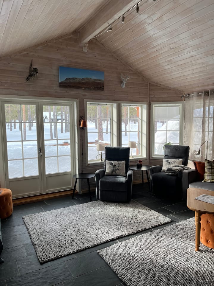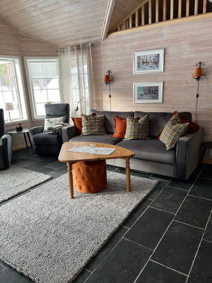 Toka ukiwa na sakafu yenye joto na sebule nzuri/jiko. Toka kwenye mtaro wenye nafasi kubwa ambao unazunguka sehemu kubwa za nyumba ya mbao. Pia kuna meza na viti kwa ajili ya matumizi ya bila malipo kwenye mtaro.